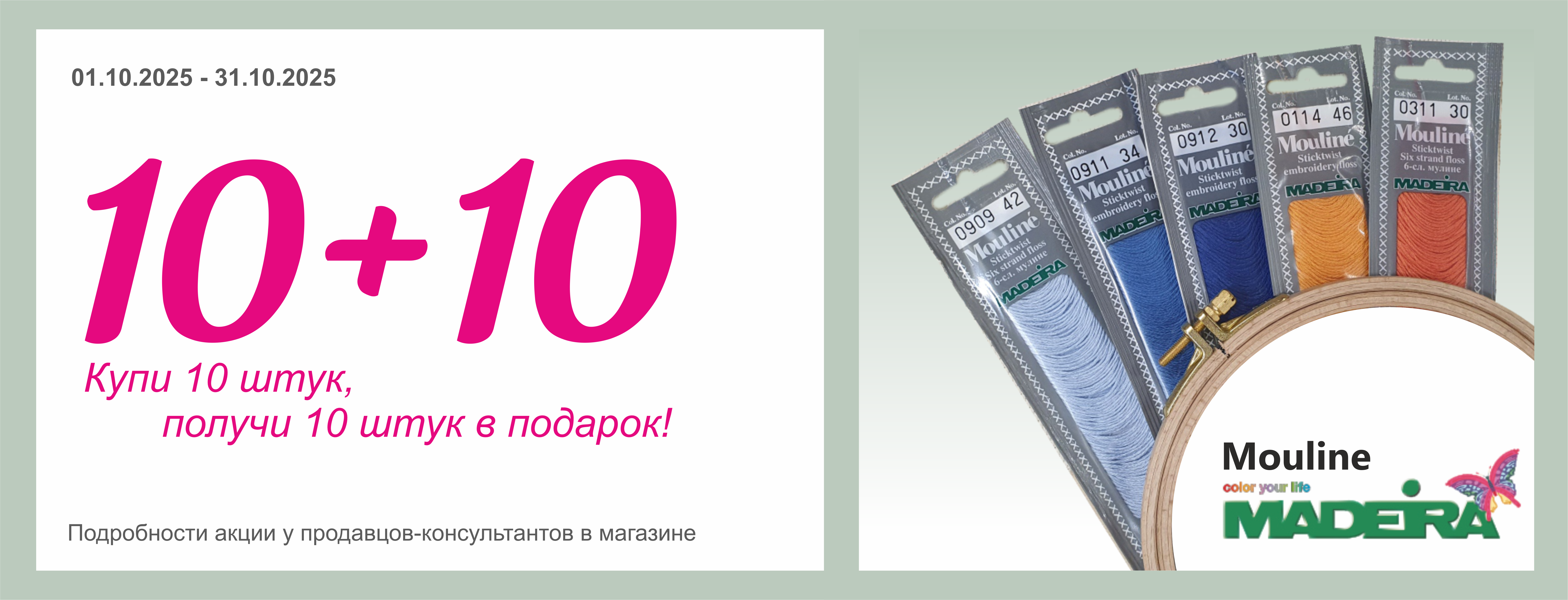 Пришла пора запасаться нитками мулине! Потому что в Швейном мире проходит специальная Акция: только до 31.10.2025, при покупке 10 ниток для вышивания Mouline Madeira еще 10 вы получаете в подарок!